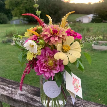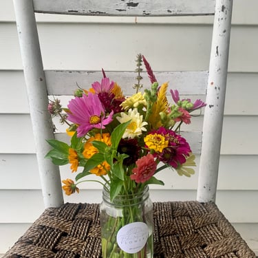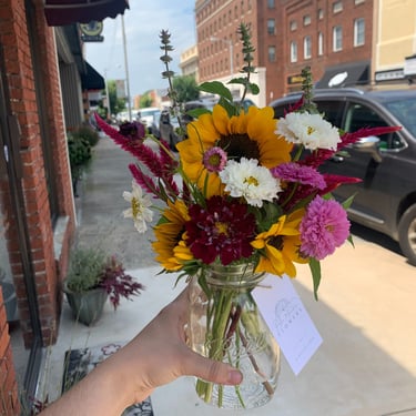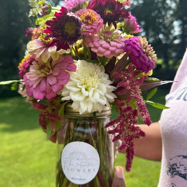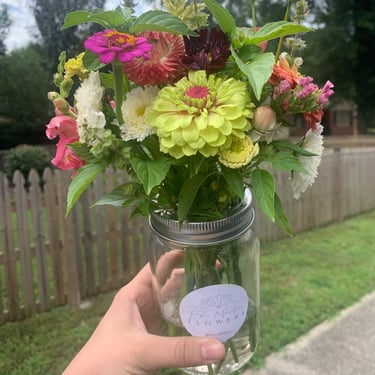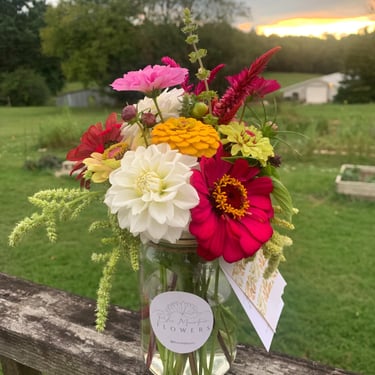 We refer to our mason jar arrangements as “happy jars” – because they are exactly that! These pint jars are packed full of fresh cut flowers and are a perfect happy present for yourself or a friend.