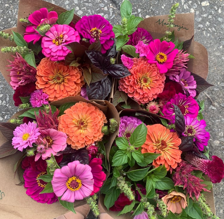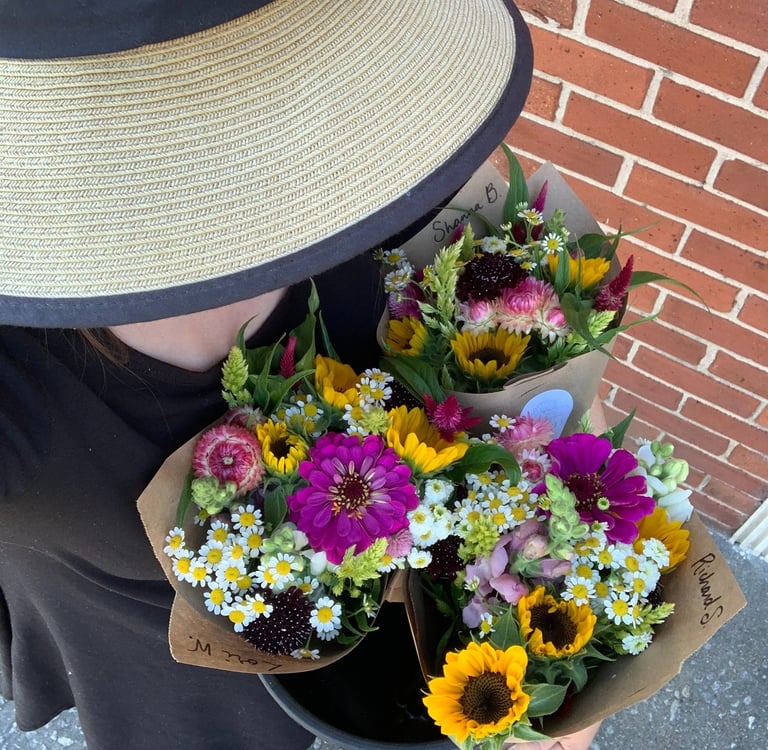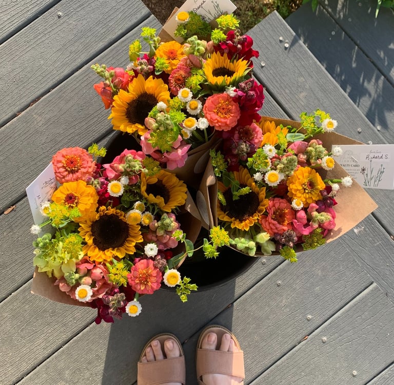 This subscription program spans the entire summer, June-September. You will receive a fresh bouquet of locally grown flowers either once per month or every other week. Choose from free pickup [at the Tuesday evening Wilkes County Farmer's Market or at our farm in Ronda] OR delivery up to 30mi from our farm for an additional fee.