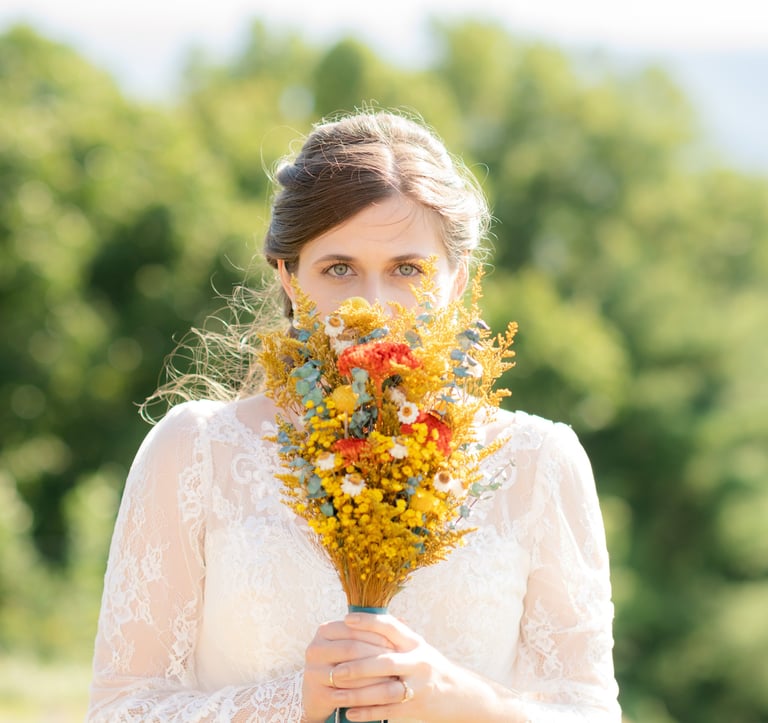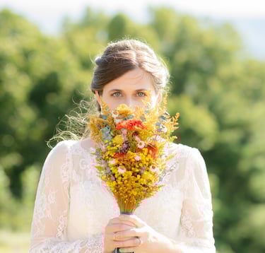 " Blue Mountain Flowers made my wedding day florals an absolute dream! She met with me early on and was able to get her seed packets of flowers that I was interested in. Mikayla sent me updates on flowers as the season progressed along with also drying several floral options as I was going to be needing them to press on my cake. She made my bridal bouquet, six bridesmaids bouquets, and nine boutonnières along with florals for the tables and cakes. I truly could not imagine that anyone could have done any better and especially someone who was so willing to put their heart and soul into making my vision a reality. Mikayla does this very thing for every person she encounters."